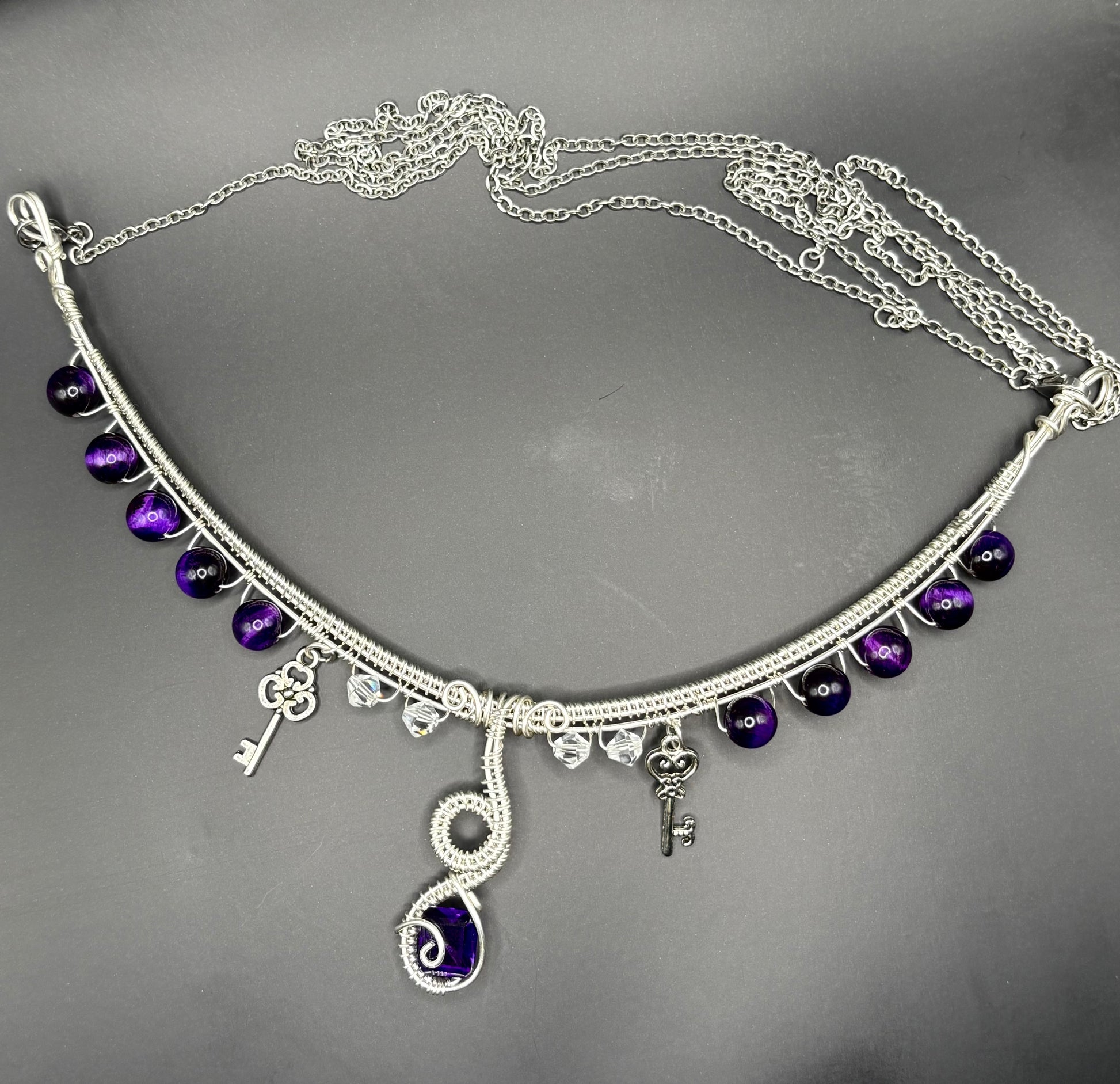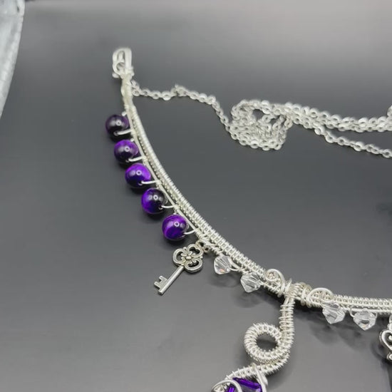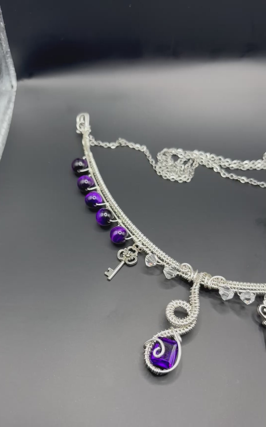 Amatista is a duel bail necklace of pure Sterling Silver design. Featuring multiple hues of royal purple from the purple tigers eyes, and a rectangular Amethyst gemstone. Two keys symbolizing the freedom, knowledge and control of opportunity.