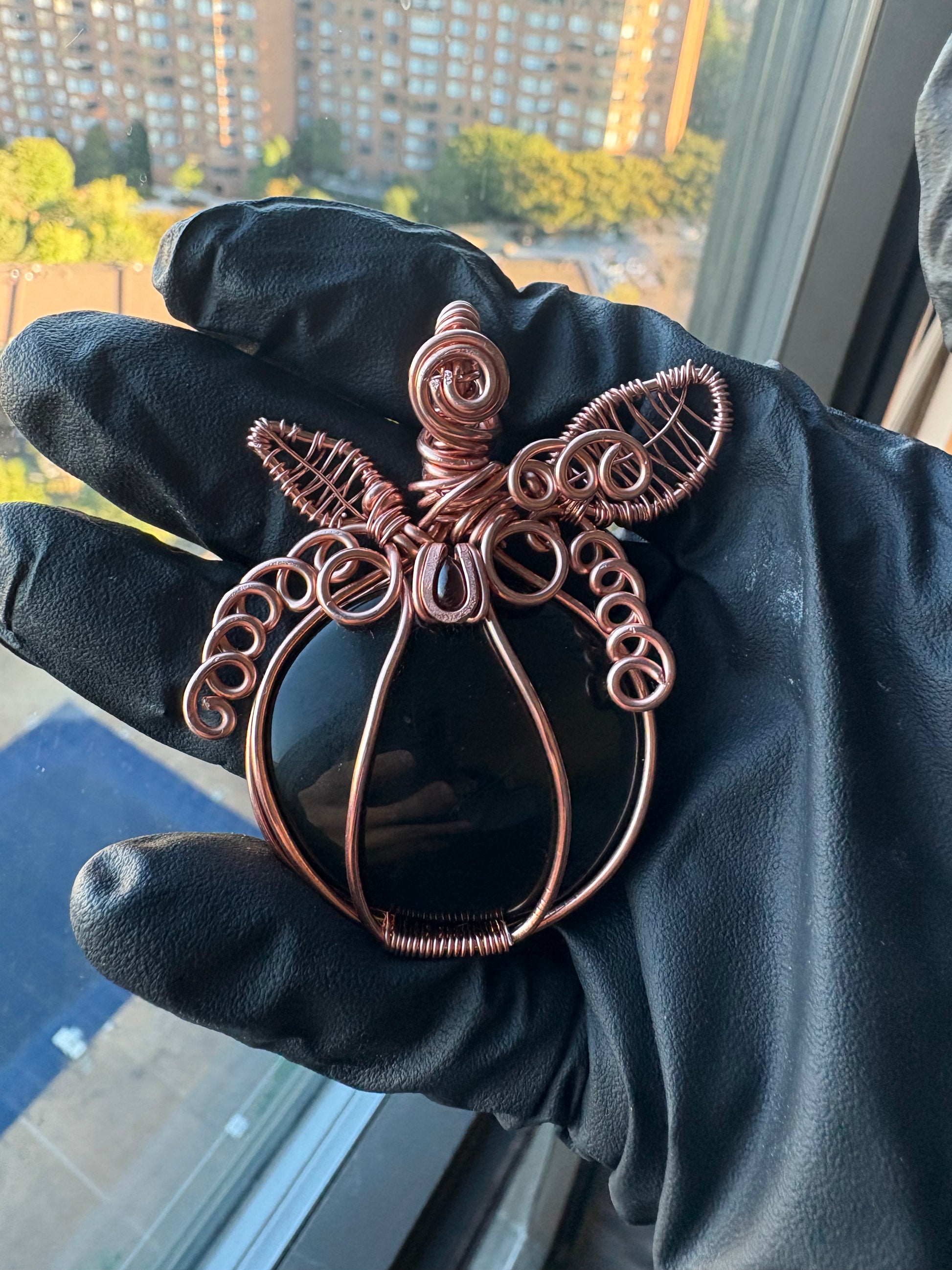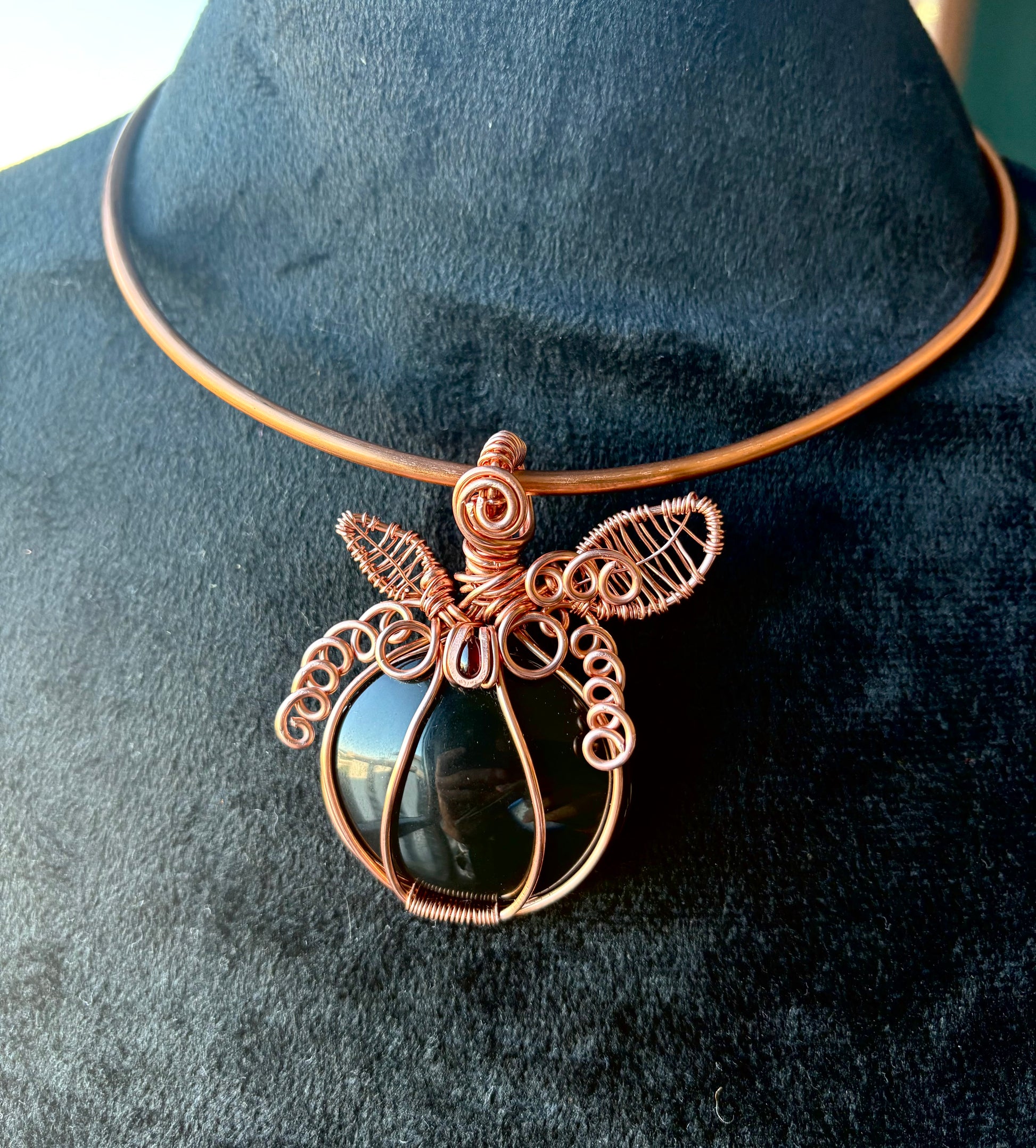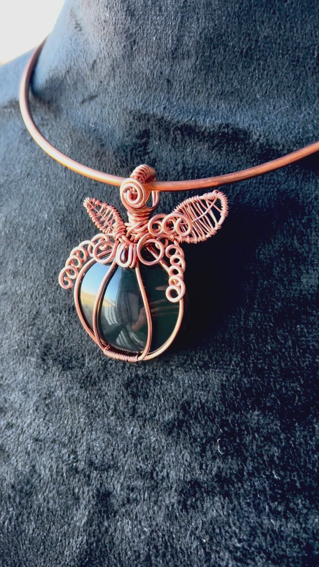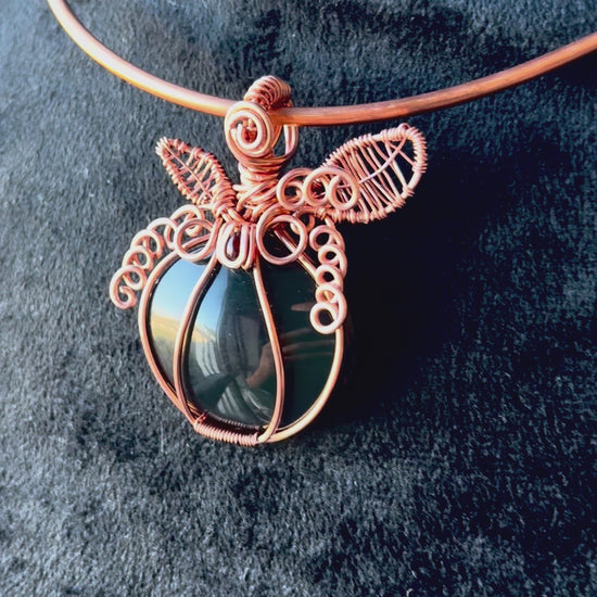 Black Autumn is made with 100% copper, a rainbow obsidian which shines green in the light, and a garnet in the center.