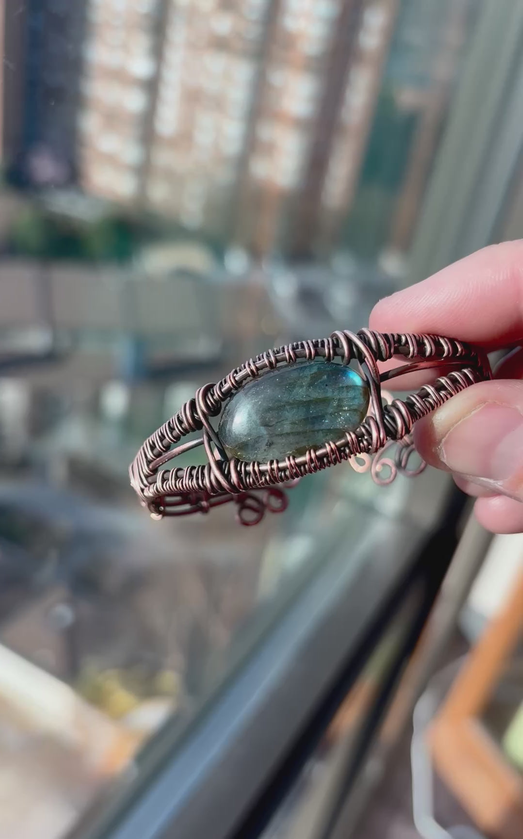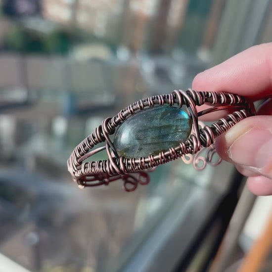 A 100% copper cuff made with a stunning blue flash labradorite.
