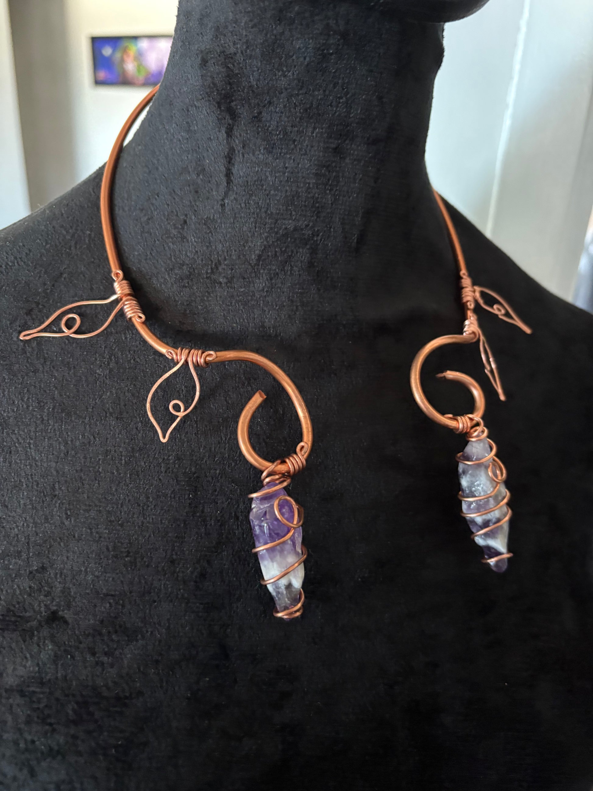 The construction of this necklace is a unique one. Came to me when trying to materialize the feel of calmness, stillness and tranquility. While attempting to introduce a style that made this piece shine. A pendant was out of the question. I needed it be FELT! Thats when i thought, how about electrical copper 8 gauge and amethyst at each end? Continuously reciprocating energy with the help of a copper tether. Paloma which means Dove in Spanish was born. A dove has held a high regard to peace which is what Paloma gives to its wearer.