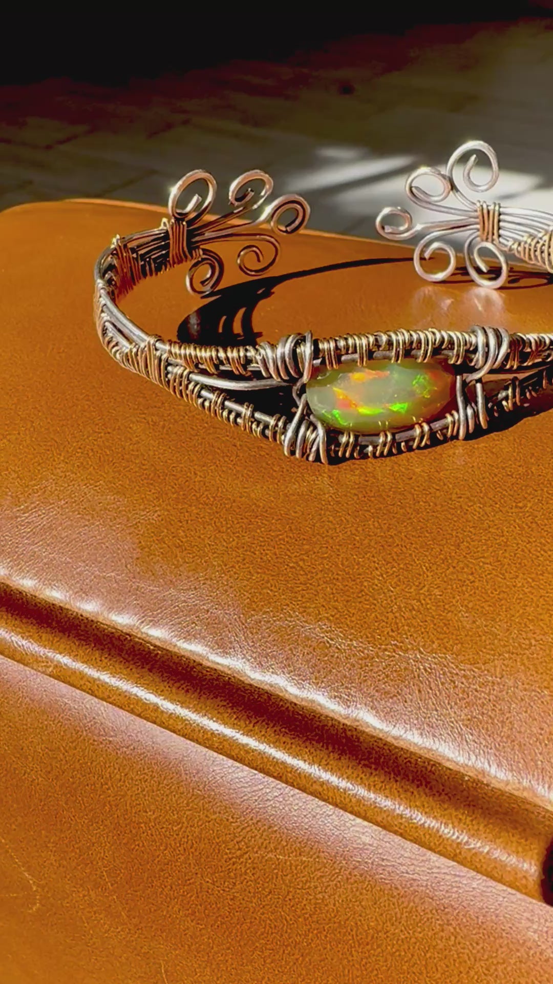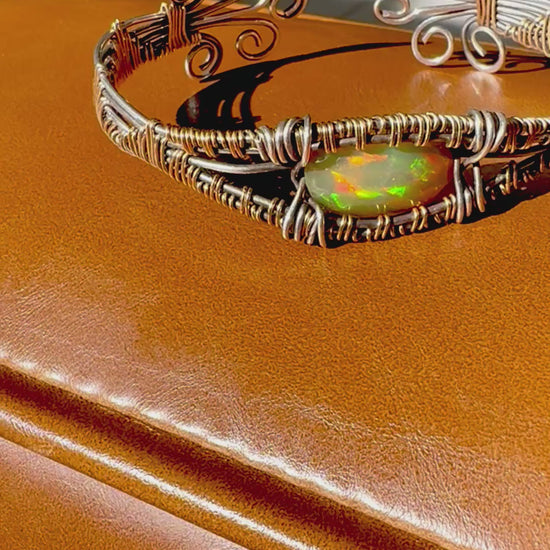 The Eden cuff and exquisite masterpiece combining sterling silver and 14k gold. Its center stone a fabulous Ethiopian Opal with extravagant flash of color in any light. Opals are meant to be incased with silver and gold to bring its elegant electric dance party of colors to life. Good for men and women alike.